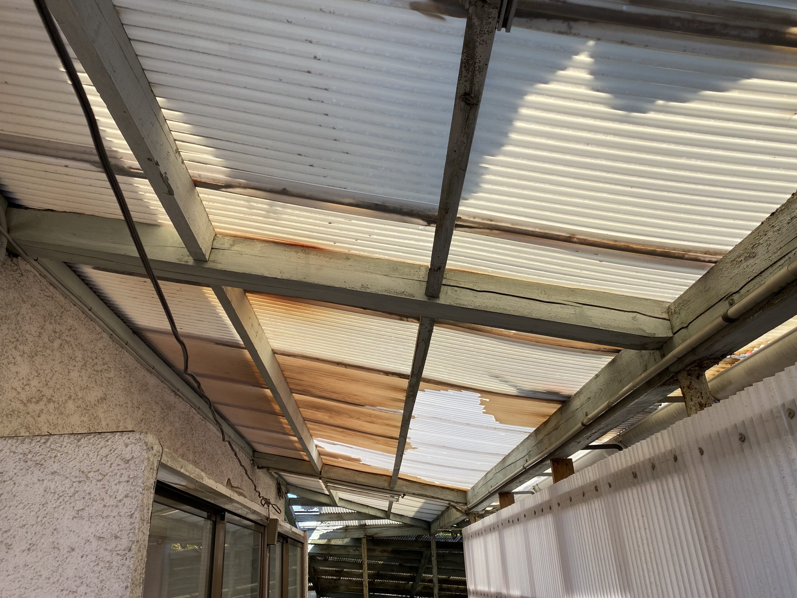 「波板が白っぽく濁っている」「全体的に黄色く変色した」 これらはポリカーボネートの寿命を示すサインです。弾力性が失われて脆くなっており、少しの衝撃や雪の重みで簡単に割れてしまう状態です。