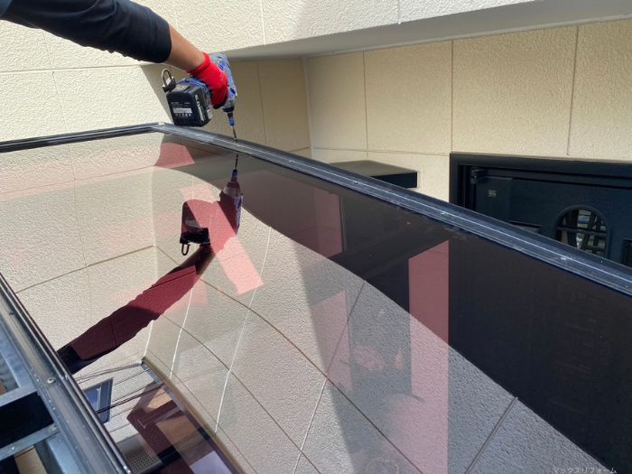 周辺のお車やご近所様へ配慮し、徹底した安全管理のもと工事を行います。熟練の職人が、風に強い確実な固定方法で新しい波板を設置していきます。