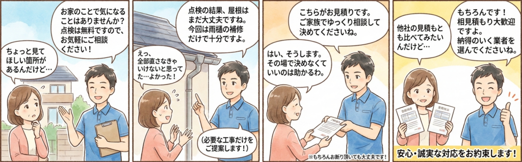 万が一、工事のご提案が必要な場合でも、相見積もりはもちろん、お断りいただいても一切問題ございませんので、どうぞ安心してご相談ください。